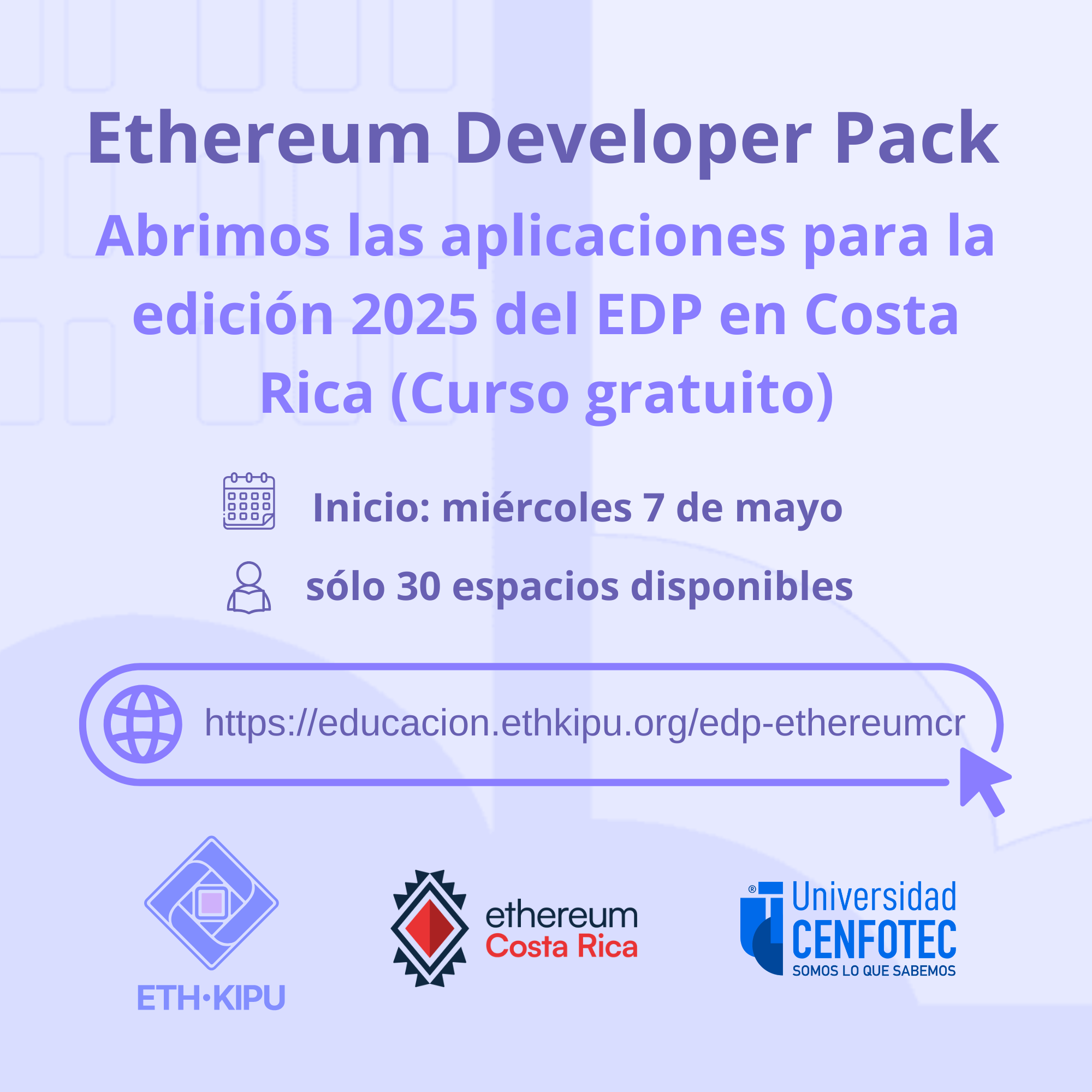 Este curso es organizado en conjunto por ETH Kipu, Ethereum Costa Rica y la Universidad CENFOTEC, con el objetivo de fomentar la educación en blockchain y contribuir al crecimiento del ecosistema tecnológico en el país.